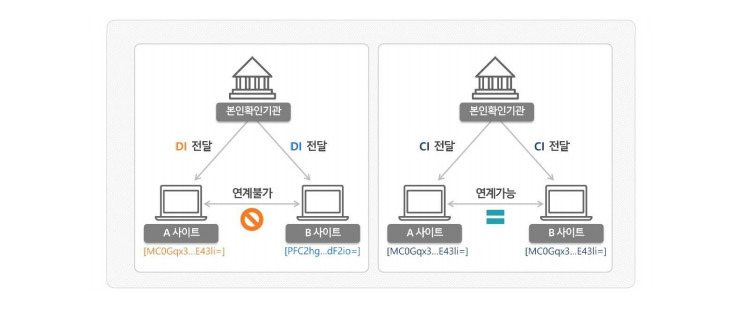 홍길동이 A사이트와 B사이트에 본인인증(휴대폰인증, 공인인증 등)을 각각 하면 두 사이트는 다른 DI값을 받게 된다 그리고 A와 B 사이트는 동일한 CI를 받게 된다.